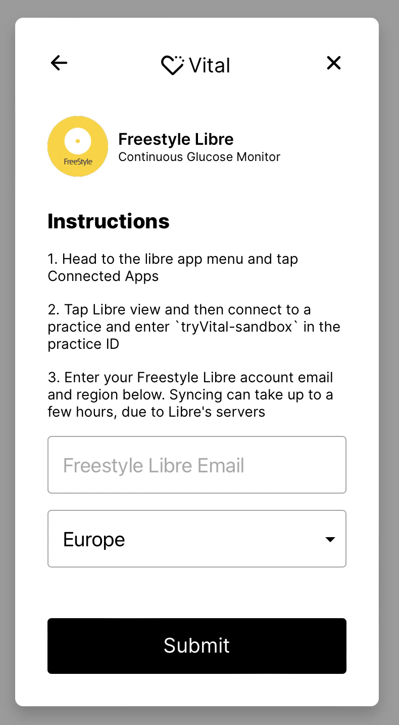 You need to ask your user to add one of the above practices in their Libre App. Once that’s done, data will start flowing. To connect your user to Junction via the Link Widget you can follow the guide here.